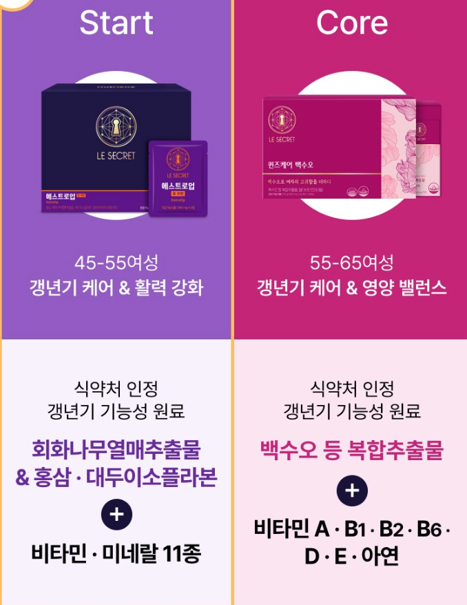 - 특징: 갱년기 여성들이 특히 주의해야 하는 에스트로겐 감소와 관련된 증상을 완화하는 제품입니다.