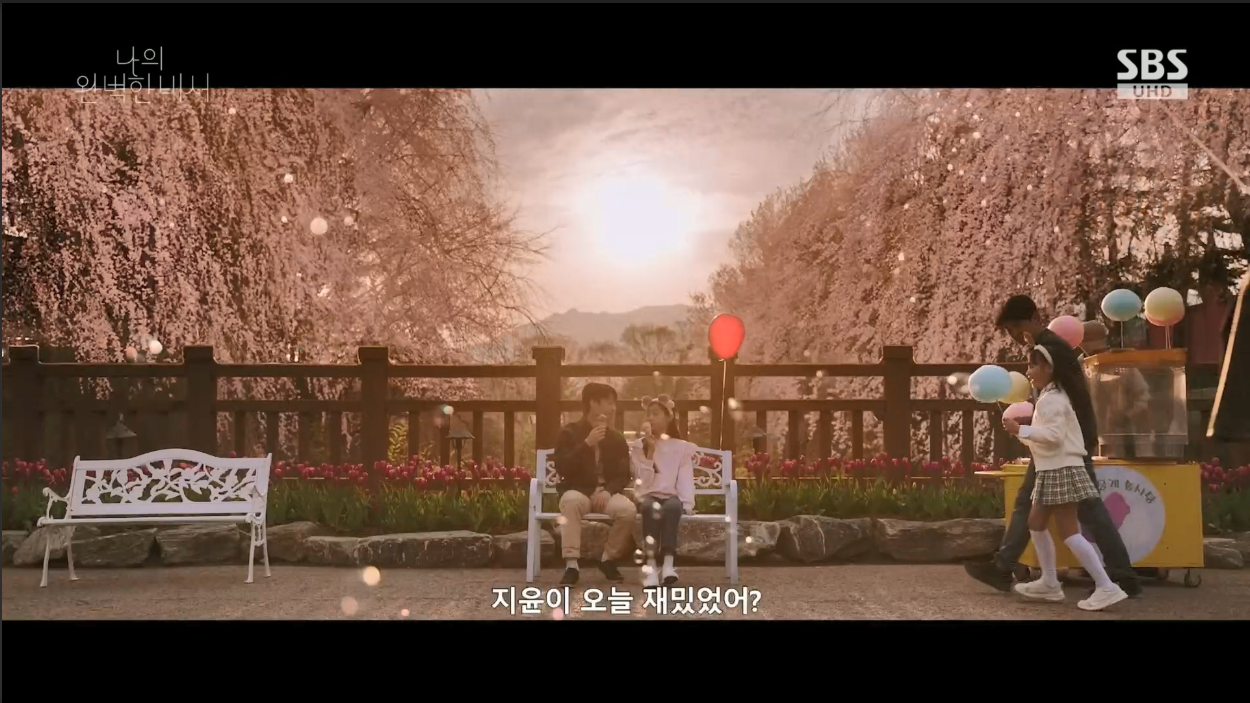 강지윤이 출근길에 벚꽃잎이 날리자 아버지와 놀이동산에서 놀던 회상을 하는 장소