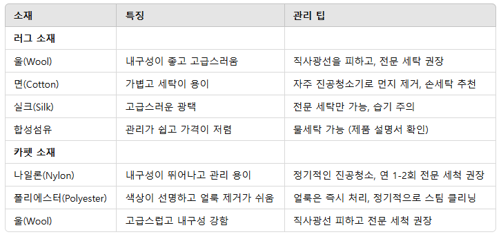 러그 및 카펫 소재별 특징과 관리법