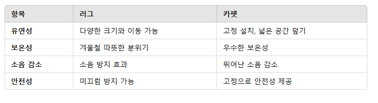 - 청소 및 유지보수: 러그는 세탁이 용이, 카펫은 주기적인 청소 필요