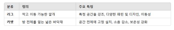 - 디자인과 용도: 러그는 인테리어 포인트, 카펫은 고급스러운 분위기 연출