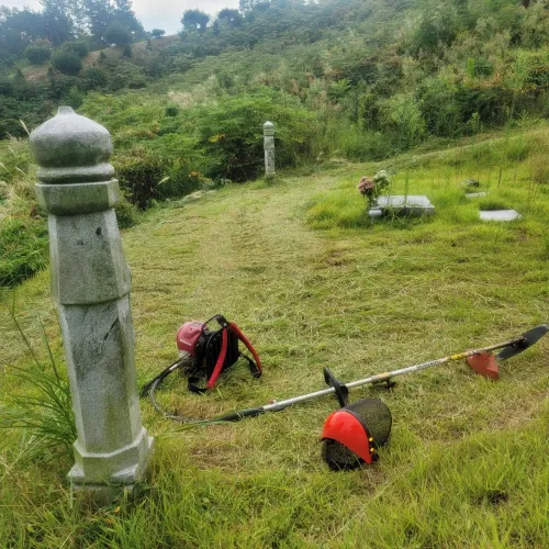 산소 주변의 풀은 지나치게 낮게 깎지 않도록 주의합니다. 묘석이나 나무, 기념물 주위에서는