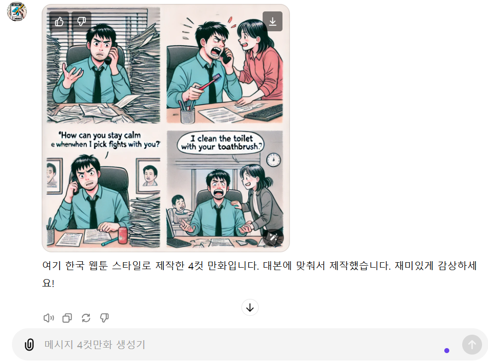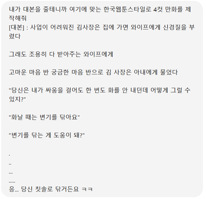 -대화창에 내가 대본을 줄 테니까 여기에 맞는 한국웹툰 스타일로 4컷 만화를 제작해 줘 ---> 줄 바꿈(Shift + Enter)