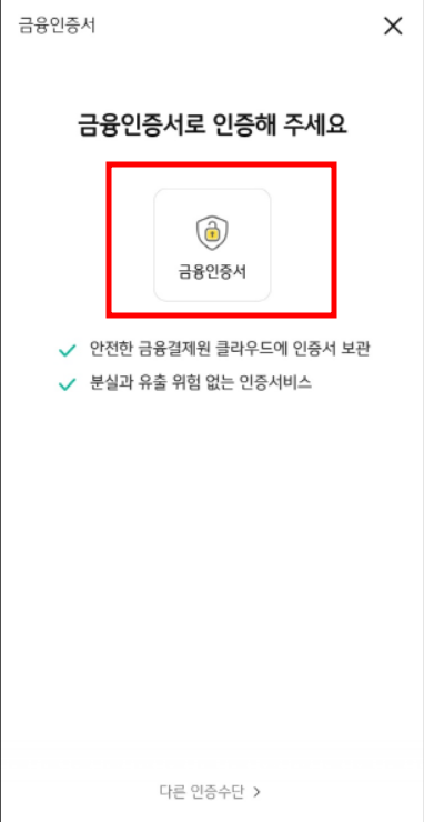 3. 금융인증서 또는 다른 인증수단 선택->